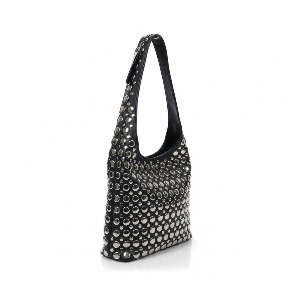Ce sac pour femme en cuir noir se distingue par son design affirmé et résolument moderne. Entièrement recouvert de clous métalliques argentés de différentes tailles, il capte immédiatement le regard et apporte une touche rock-chic élégante à toutes les tenues.