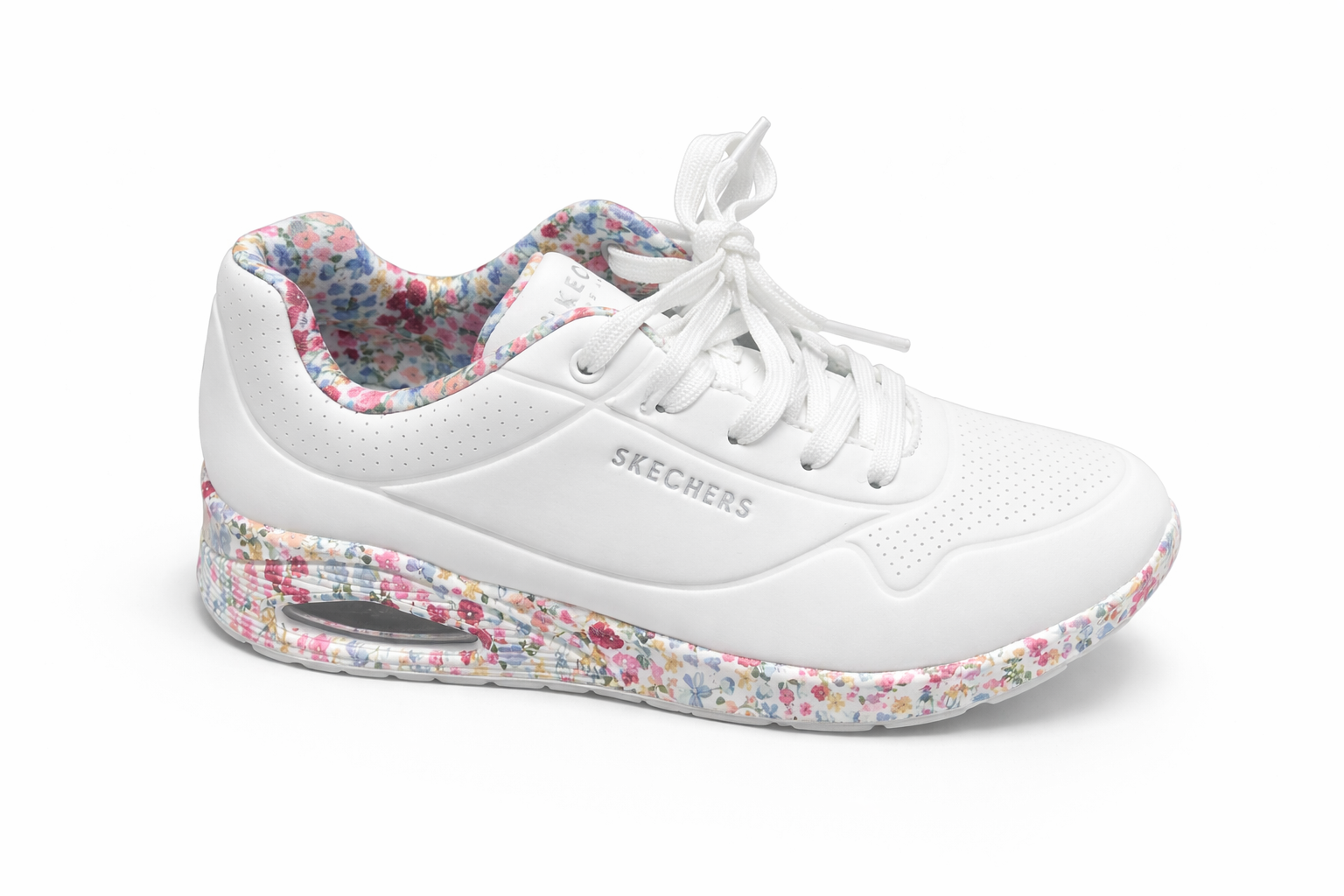Il s’agit d’une basket basse au style à la fois moderne, féminin et élégant. La silhouette est épurée avec une tige majoritairement blanche, rehaussée par des touches florales colorées qui apportent une note fraîche et printanière.