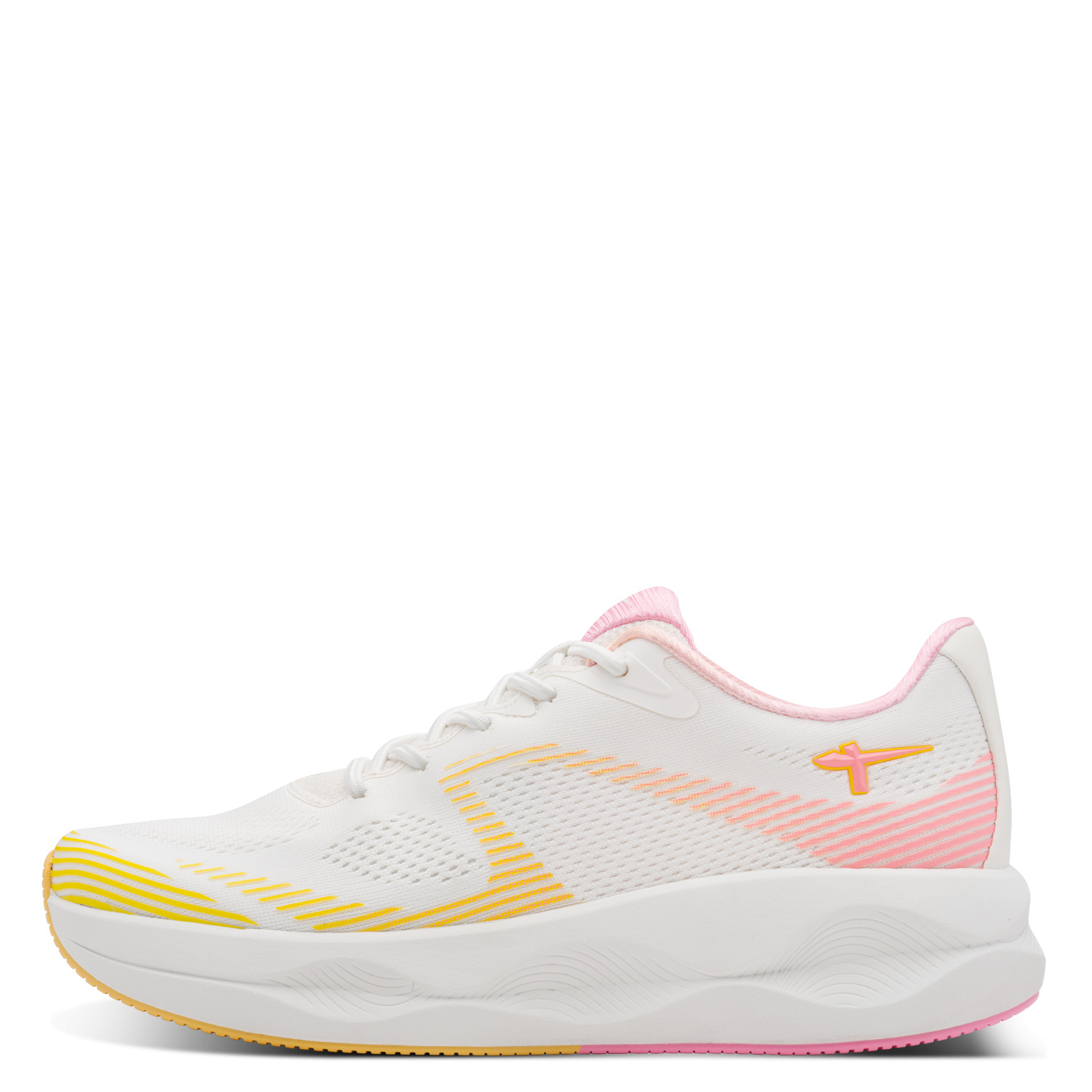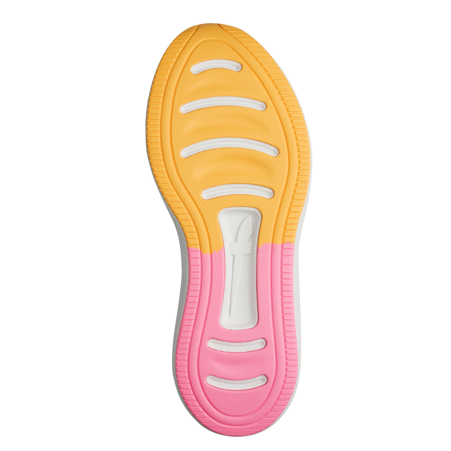 Conçue en toile technique respirante, cette basket séduit par sa silhouette épurée et sportive. Sa base blanche lumineuse est rehaussée de détails graphiques jaunes et roses, apportant une touche dynamique et féminine.