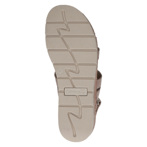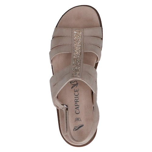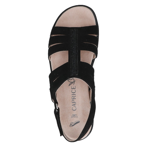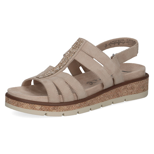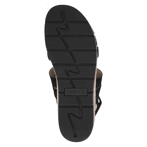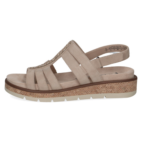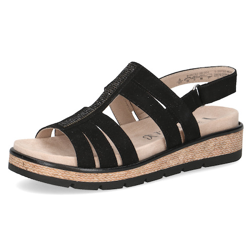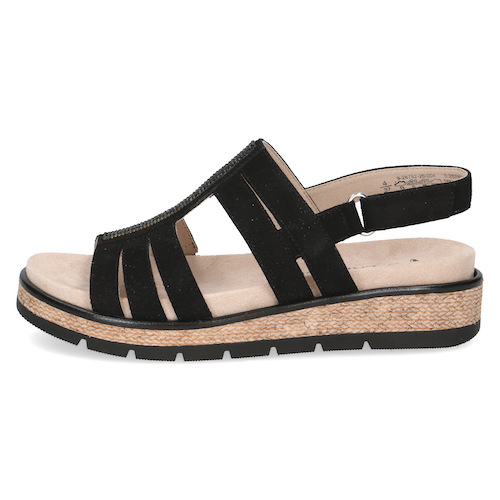 Cette sandale compensée Caprice se distingue par son design moderne à multiples brides, sublimé par une bande centrale ornée de strass qui apporte une touche élégante. Sa semelle compensée effet corde offre une légère hauteur tout en restant stable et confortable, idéale pour marcher au quotidien.