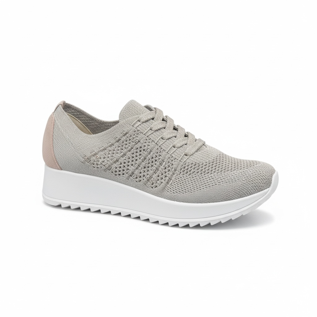Ces baskets pour femme présentent un design moderne et épuré, dans une élégante teinte beige naturelle. La tige est réalisée en toile maille textile, offrant un aspect légèrement texturé et respirant. Le motif en maille varie subtilement sur les côtés, avec un travail de tricot plus ajouré au niveau du milieu du pied, ce qui apporte à la fois une touche esthétique contemporaine et une meilleure ventilation.