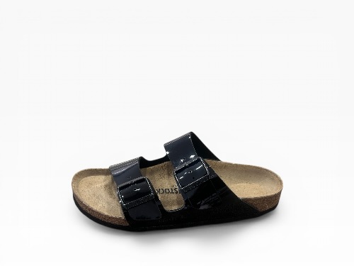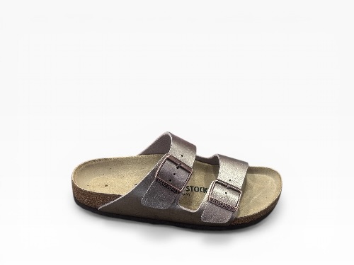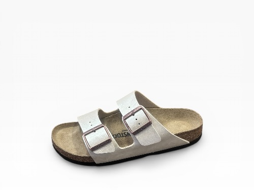 Sandales femme Birkenstock modèle Arizona, reconnaissables à leurs deux brides ajustables avec boucles métalliques, offrant un maintien optimal et un style intemporel. Dotées d’une semelle anatomique en liège et latex, elles assurent un confort durable au quotidien.
