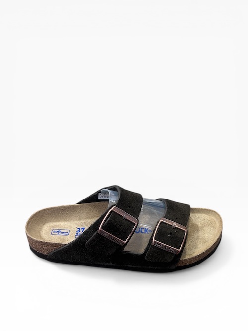 Mule iconique Arizona de Birkenstock, en cuir velours déclinée en marron, taupe et camel. Ses deux brides ajustables assurent un maintien parfait, tandis que le lit de pied anatomique en liège épouse la forme du pied pour un confort incomparable au quotidien