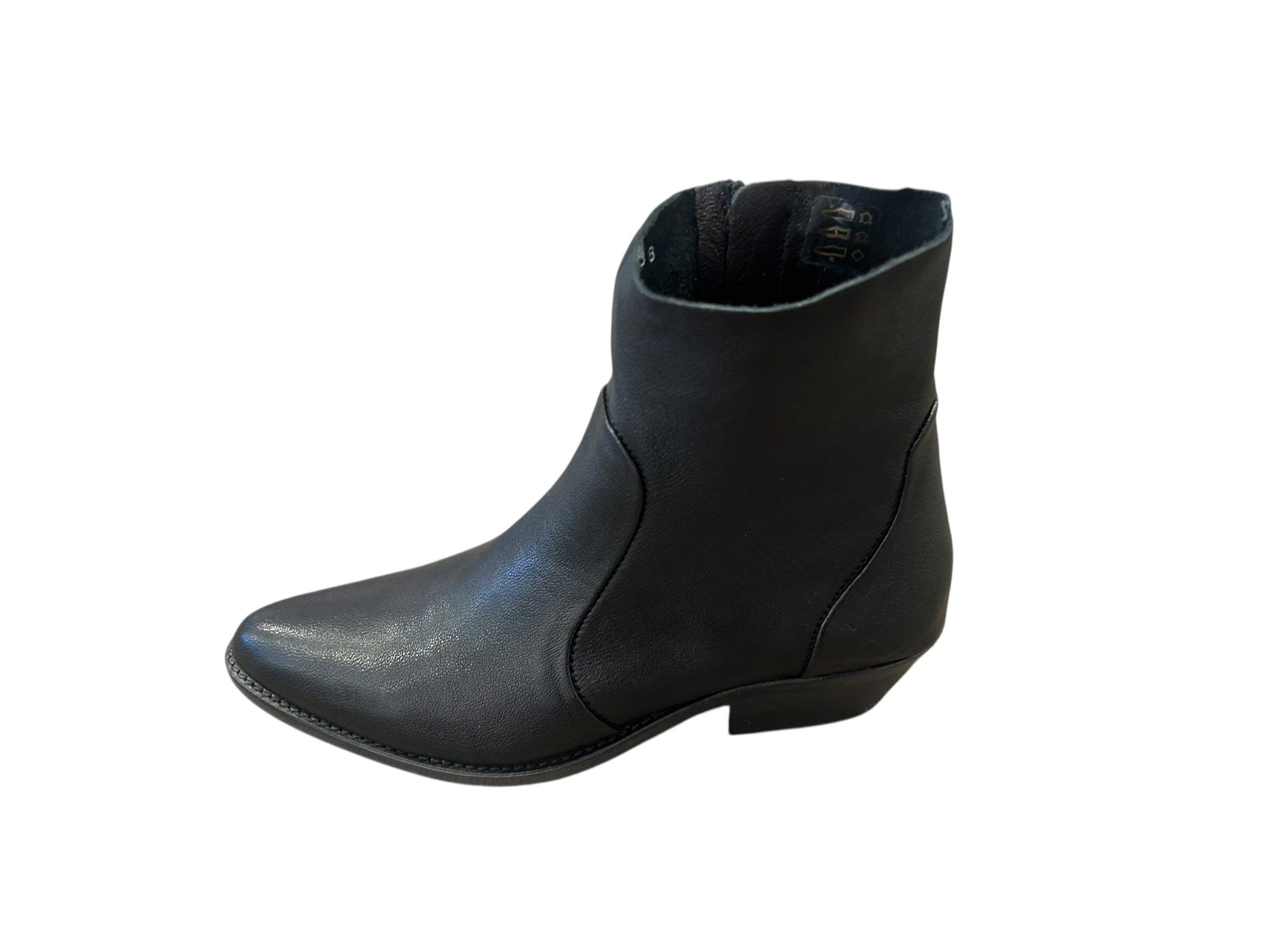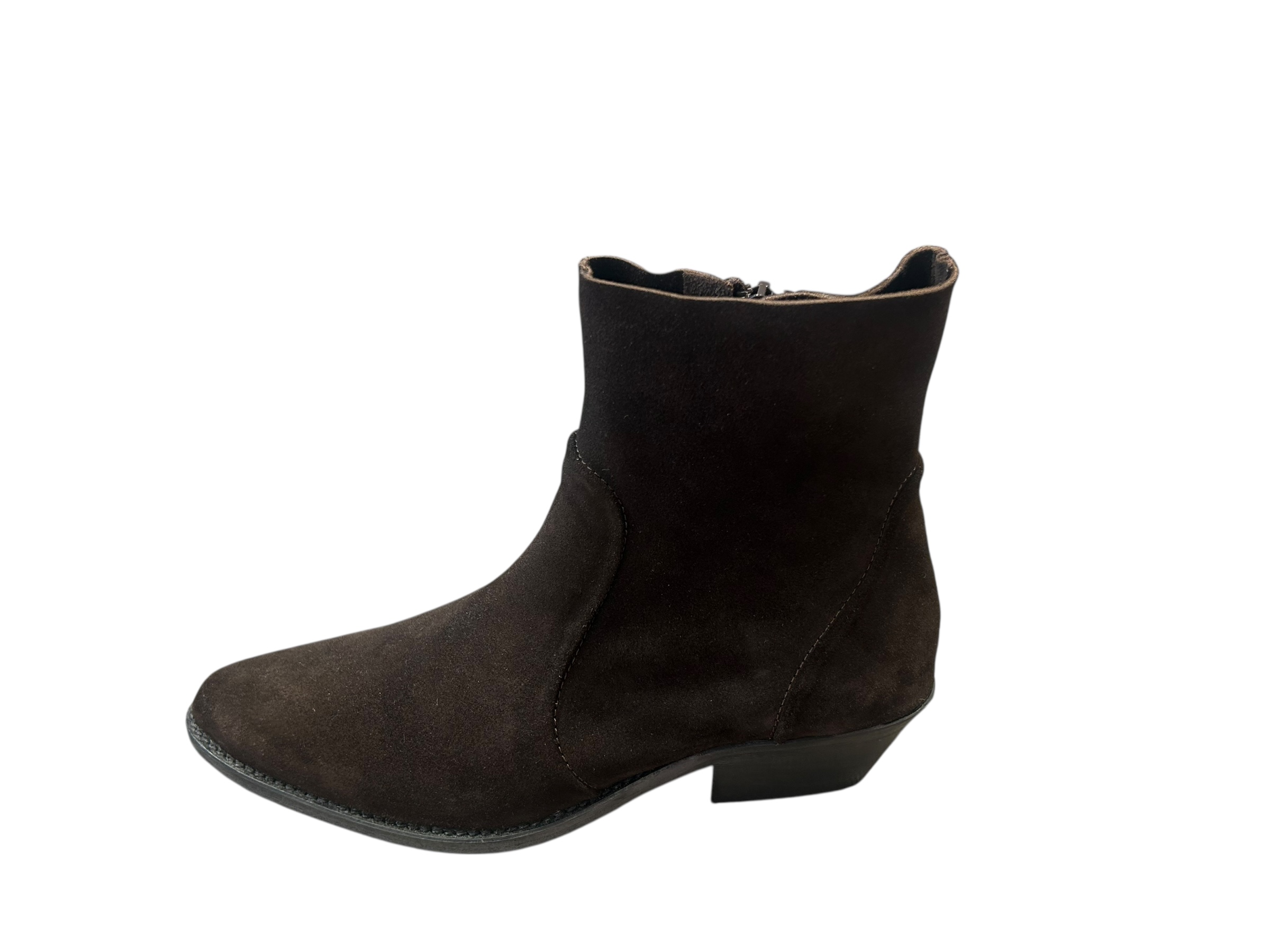 Cette chaussure est une bottine femme en cuir suédé (effet daim), de couleur marron chocolat, au style western minimaliste.