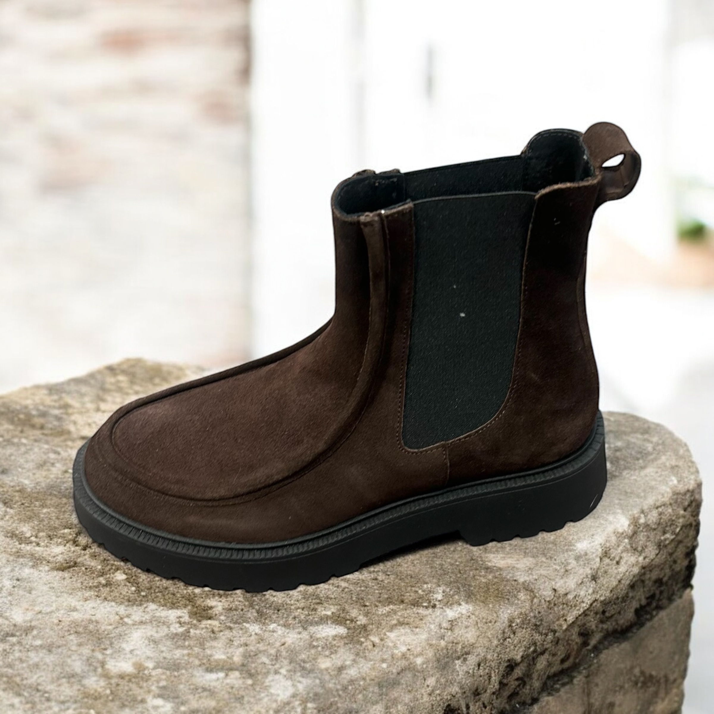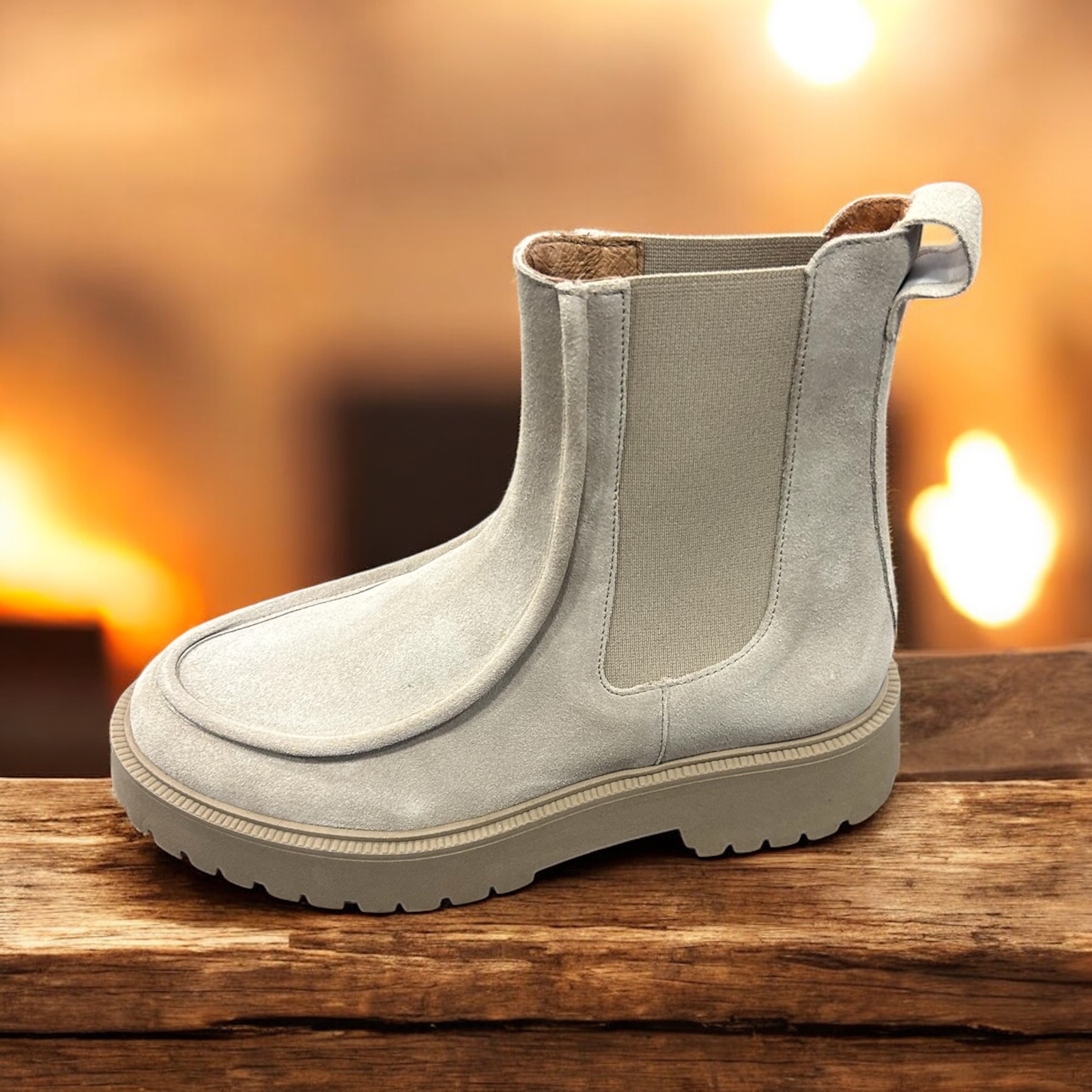 Le modèle Lola est une boots à grosse semelle en velours beige et marron de la marque Valroy.