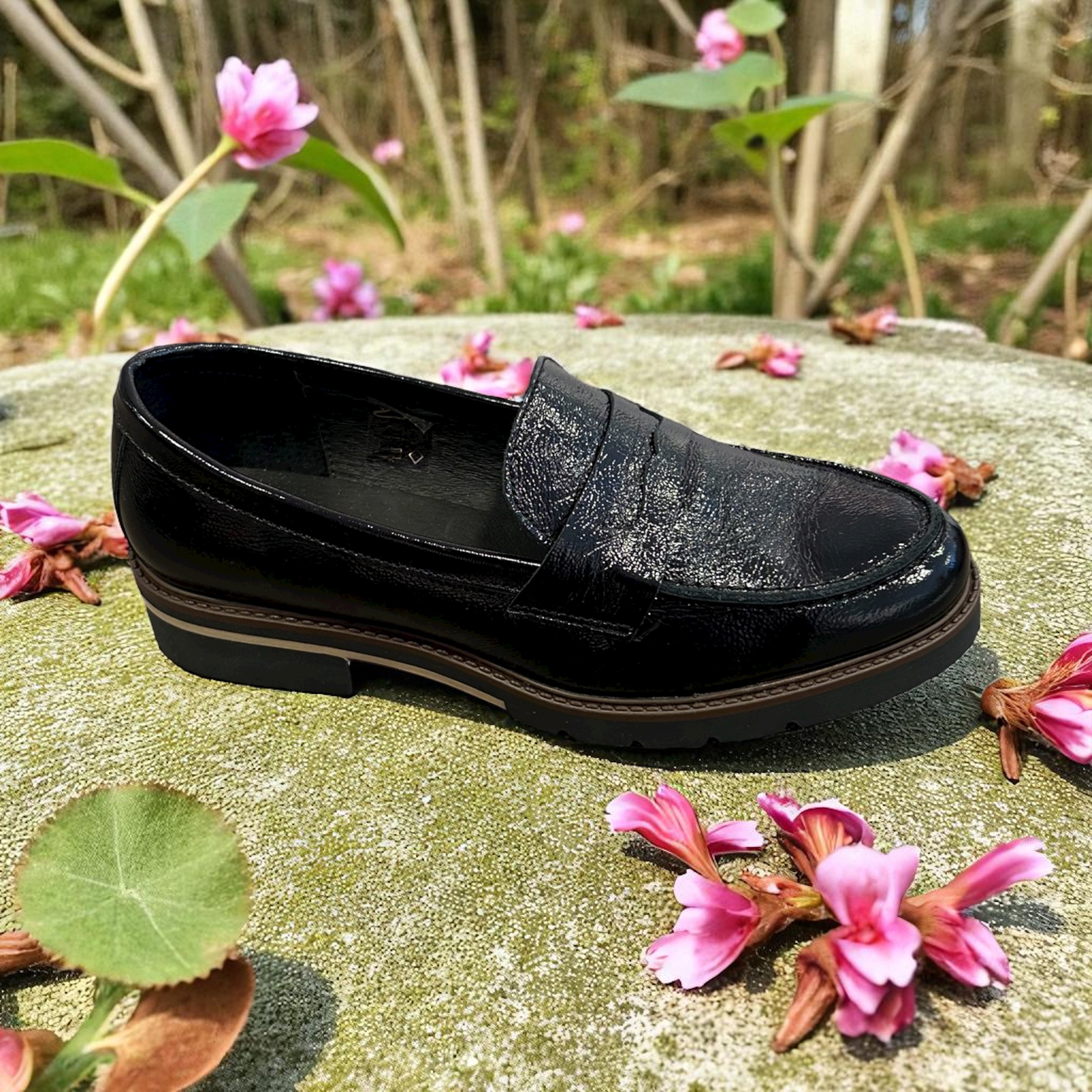 Le modèle Mexico est une mocassin en cuir et vernis noir de la marque Valroy