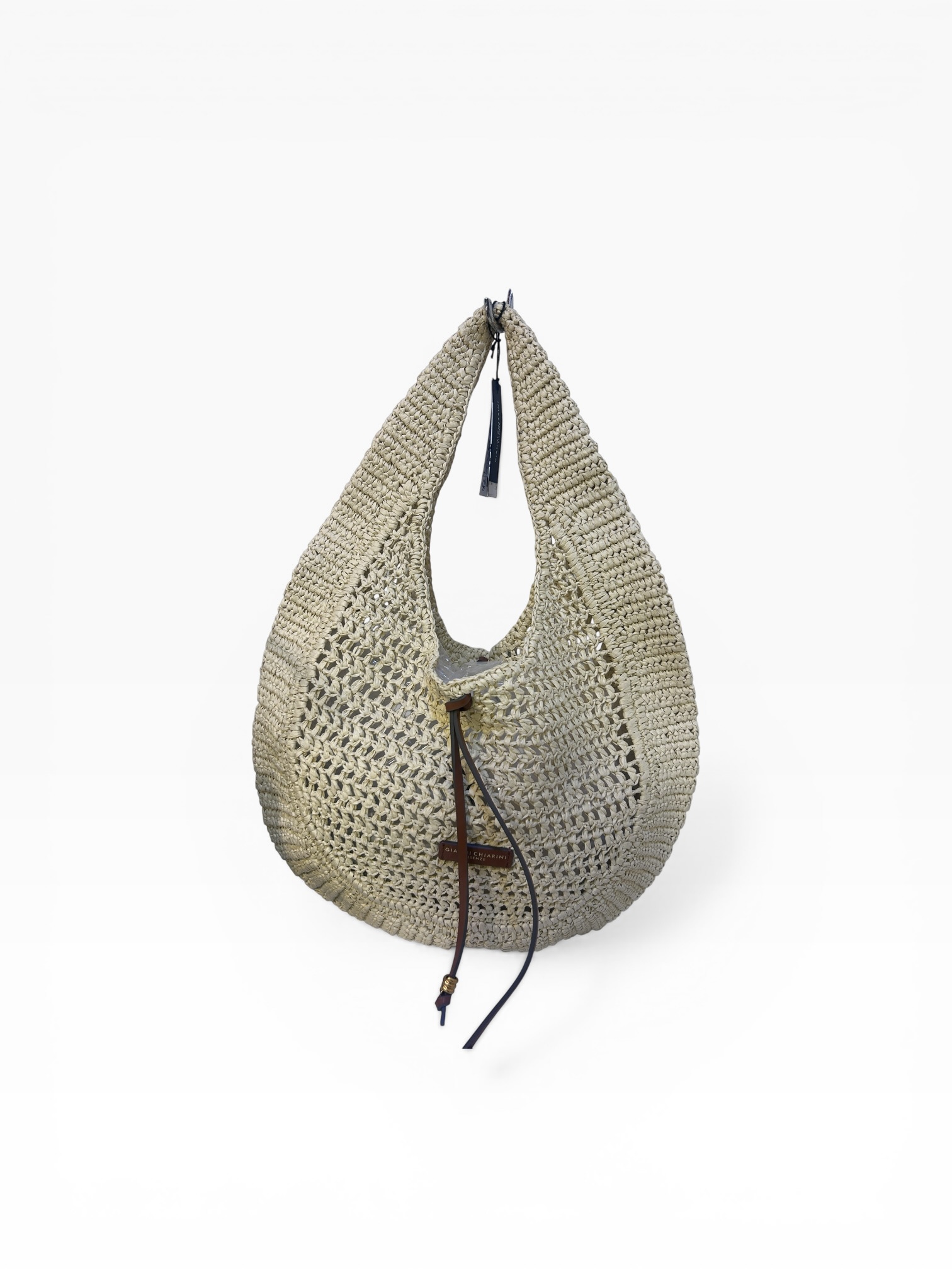 Un petit pendentif ou étiquette de la marque vient compléter le design et signe discrètement l’accessoire.