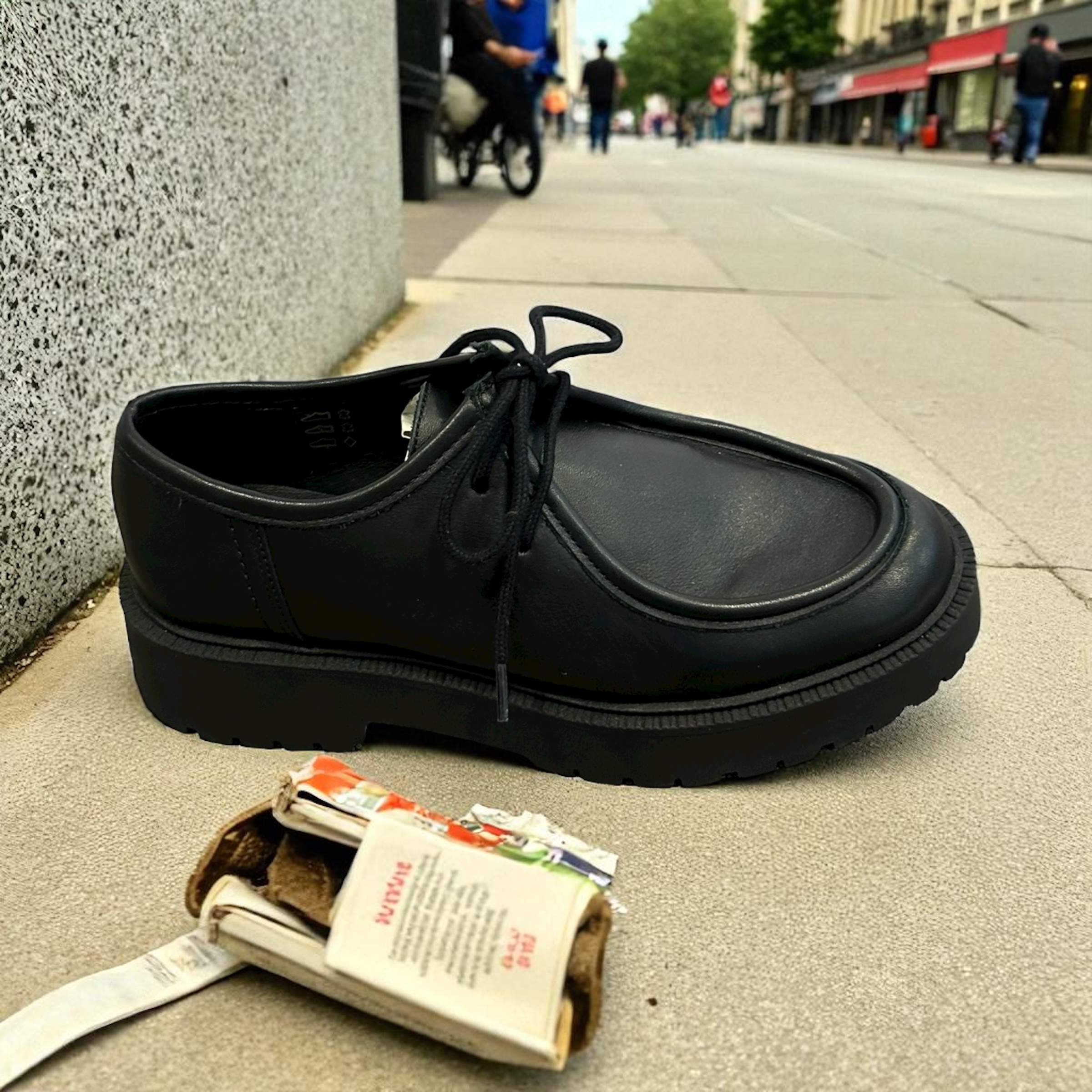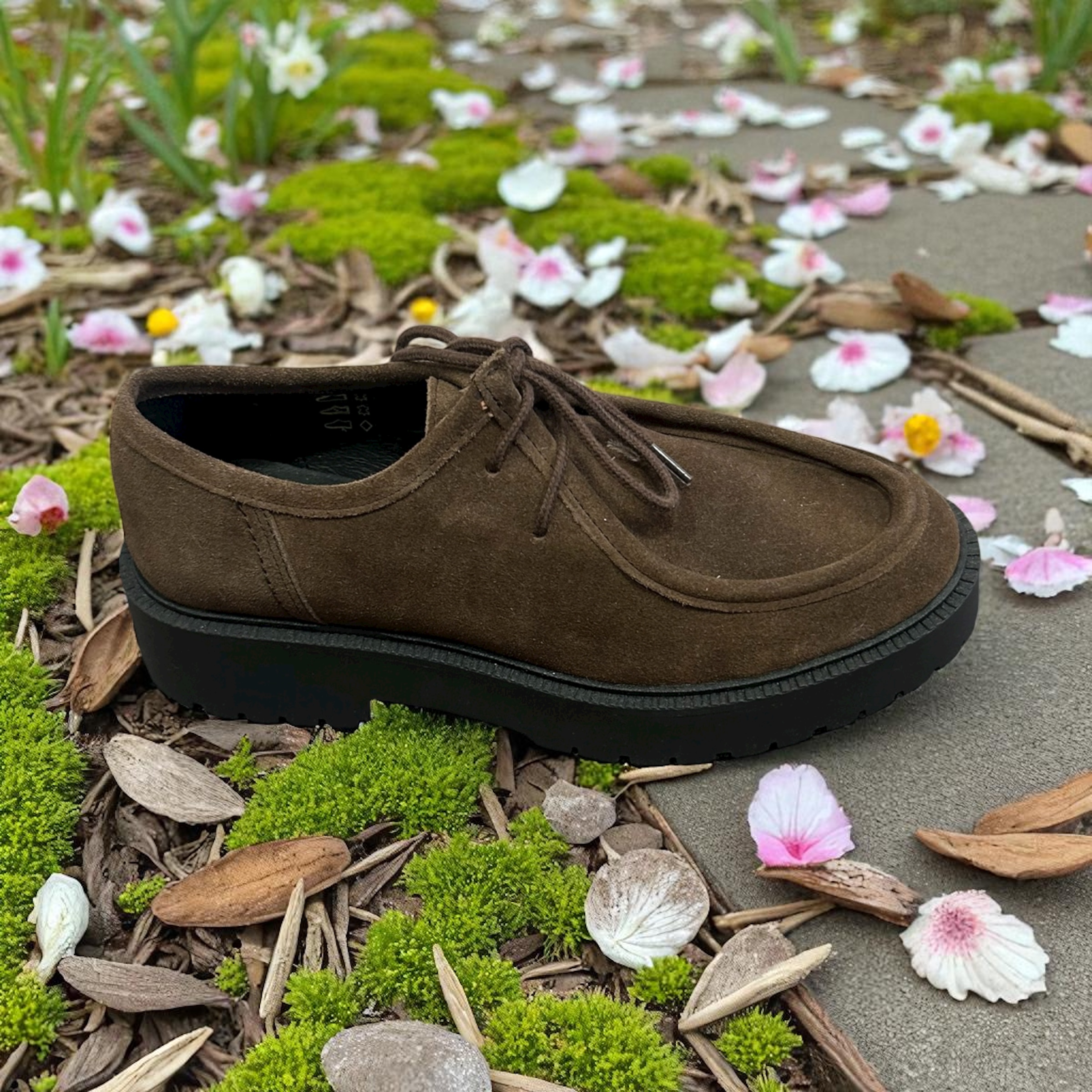 Le modèle Sofia est un derby en cuir noir et velours marron de la marque Valroy